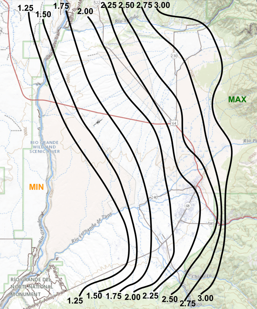 Areas along the foothills from around Arroyo Seco, then south into the Canon area and then west towards Talpa received the most rain at about 2.50 to 3.00 inches. Much of the central part of the valley from Ranchos north into Taos and the US 64 / NM 522 / NM 150 intersection received a little above average amounts. At my northside location, rainfall totaled 2.12 inches, about a quarter of an inch above average. About the driest location was once again down near the golf course west of Ranchos where amounts of around 1.25 inches occurred (see map below).