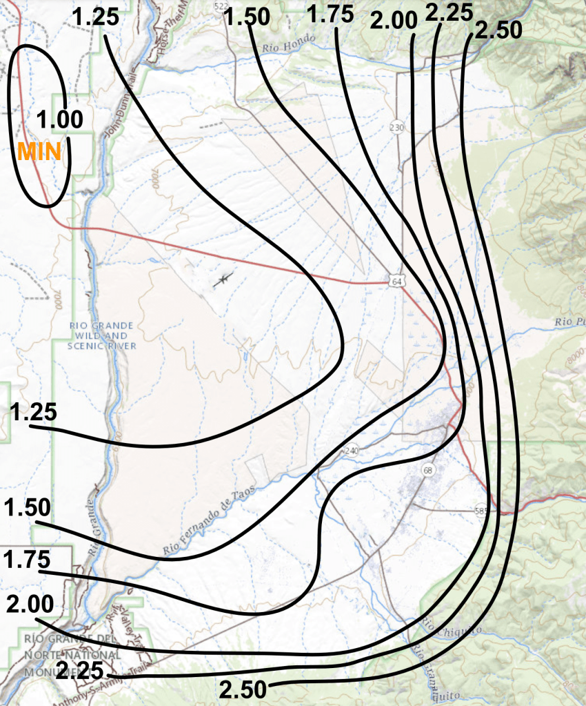 Precipitation totaled 1.27 inches at my northside location, a little more than a third of an inch above average. Most areas in the valley recorded more rain however, with areas around Taos and Ranchos de Taos receiving 1.50 to 1.80 inches of rain (see map below). Highest amounts occurred along the eastern and southern foothills where amounts ranged from 2.00 to 2.75 inches. A widespread rain event on the 24th brought nearly half of the monthly total to most areas.